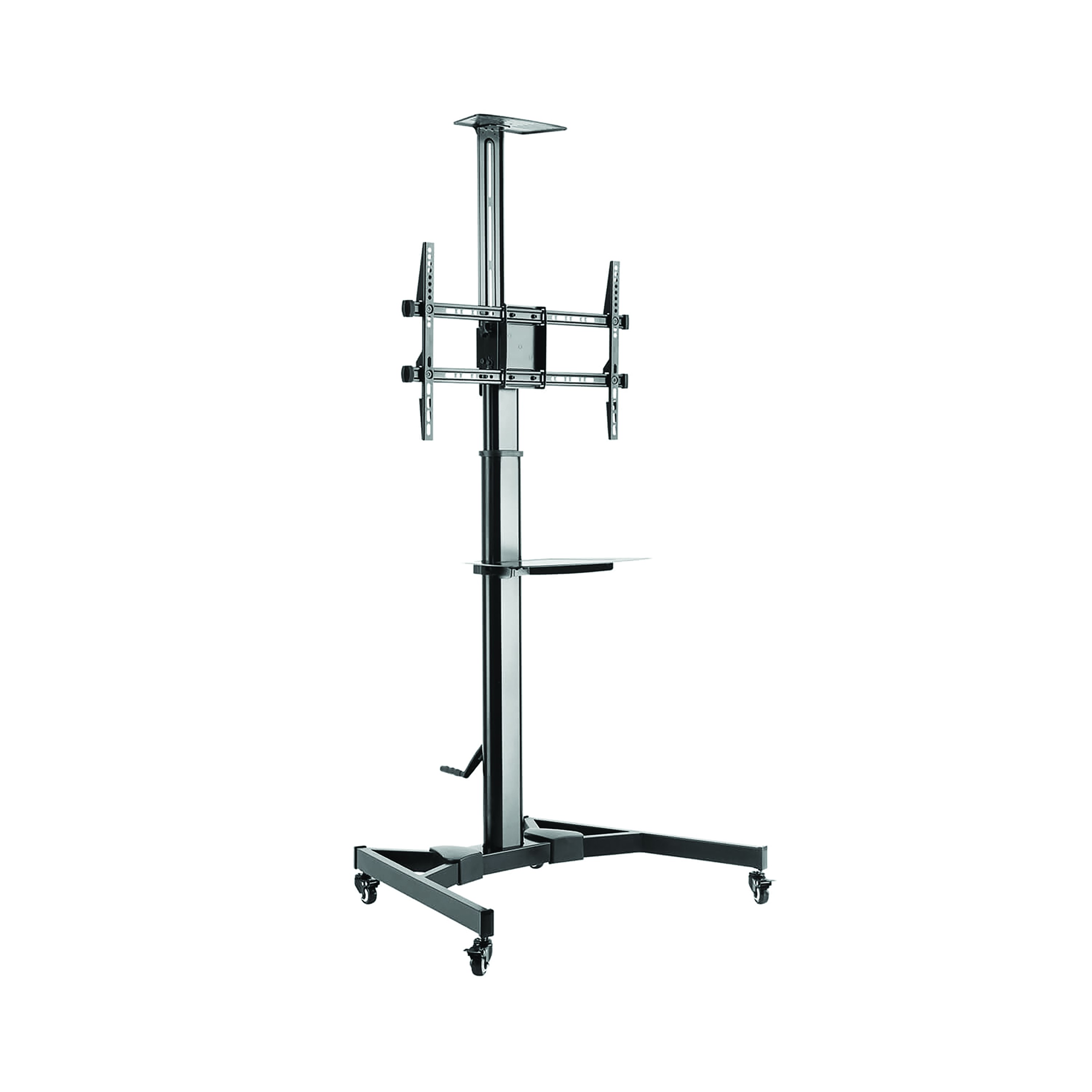 Designed for dynamic work environments, this portable TV stand is ideal for presentations, video conferencing, and collaborative setups. Its sleek, space-efficient design supports screens up to 70in and 50kg, combining robust stability with modern aesthetics. Mobility is effortless thanks to four heavy-duty casters, each equipped with a locking mechanism to keep the stand securely in place when needed. A smooth crank handle allows for height adjustments across a 40cm range, making it easy to tailor the viewing angle to your space. The stand also offers flexible screen positioning, with support for both portrait and landscape orientations and a 20 degrees tilt to reduce glare and improve visibility. Integrated cable management keeps wires neatly tucked away, while two built-in shelves provide convenient storage for AV components, helping you maintain a clean and organised setup.